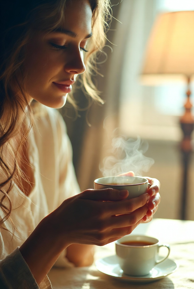 Pegang cangkir atau gelas dengan kedua tangan—rasakan kehangatan yang perlahan meresap ke telapak. Biarkan jari-jari melingkari wadah itu, nikmati sensasi hangat yang menenangkan. Hirup uap yang naik pelan—aroma teh chamomile floral atau kopi panggang yang kaya langsung mengisi ruang dengan rasa nyaman. Duduklah dengan posisi rileks: punggung bersandar, bahu turun, kaki selonjor atau disilang santai.